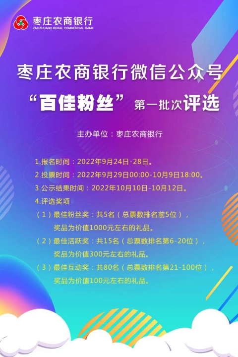 為回饋廣大公眾號(hào)粉絲的熱切關(guān)注,感謝廣大客戶長(zhǎng)期以來(lái)對(duì)棗莊農(nóng)商銀行的關(guān)心與支持,棗莊農(nóng)商銀行開(kāi)展“百佳粉絲”第一批次評(píng)選活動(dòng),最終評(píng)選出的粉絲可獲贈(zèng)神秘大禮一份,同時(shí)所有關(guān)注公眾號(hào)并參加了投票的粉絲均可參與抽獎(jiǎng)活動(dòng),更有機(jī)會(huì)獲得精美禮品一份!