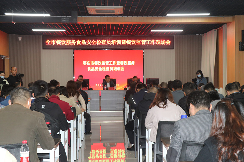 為進一步豐富餐飲服務(wù)食品安全檢查員業(yè)務(wù)知識,提升全市餐飲環(huán)節(jié)食品安全監(jiān)管水平,棗莊市市場監(jiān)督管理局根據(jù)2023年餐飲監(jiān)管工作計劃,于11月8日,在臺兒莊古城學(xué)校召開全市餐飲監(jiān)管工作暨餐飲服務(wù)食品安全檢查員培訓(xùn)會議,市、區(qū)兩級局分管局長、餐飲科全體人員、全市餐飲服務(wù)食品安全檢查員參加。會議由市市場監(jiān)管局副局長張衍耀主持;臺兒莊區(qū)委常委、副區(qū)長孫作偉致辭,并介紹建設(shè)“食安臺兒莊”的經(jīng)驗和做法;山東省市場監(jiān)管局餐飲處一級調(diào)研員遲玉聚博士,作《深刻學(xué)習(xí)領(lǐng)會習(xí)近平總書記重要論述精神努力守住食品安全底線》主題報告。