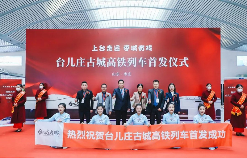 隨后,出席嘉賓共同為“臺兒莊古城”高鐵冠名專列首發(fā)啟程進行剪彩并互贈紀念品。