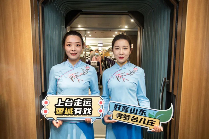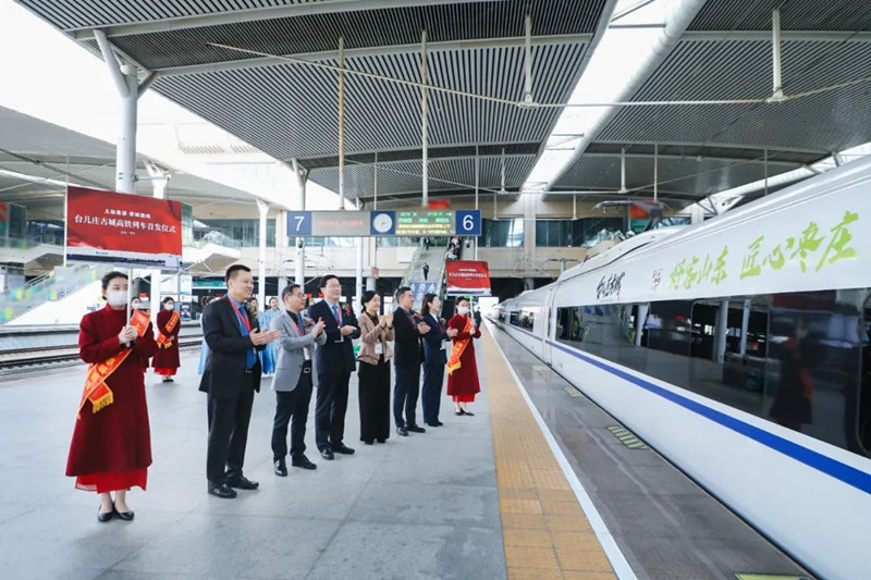 4月27日上午,由臺兒莊古城冠名的高鐵列車首發(fā)儀式在濟南西站隆重舉行。首發(fā)儀式上,車身標有“好客山東 匠心棗莊”的高鐵列車正式亮相。