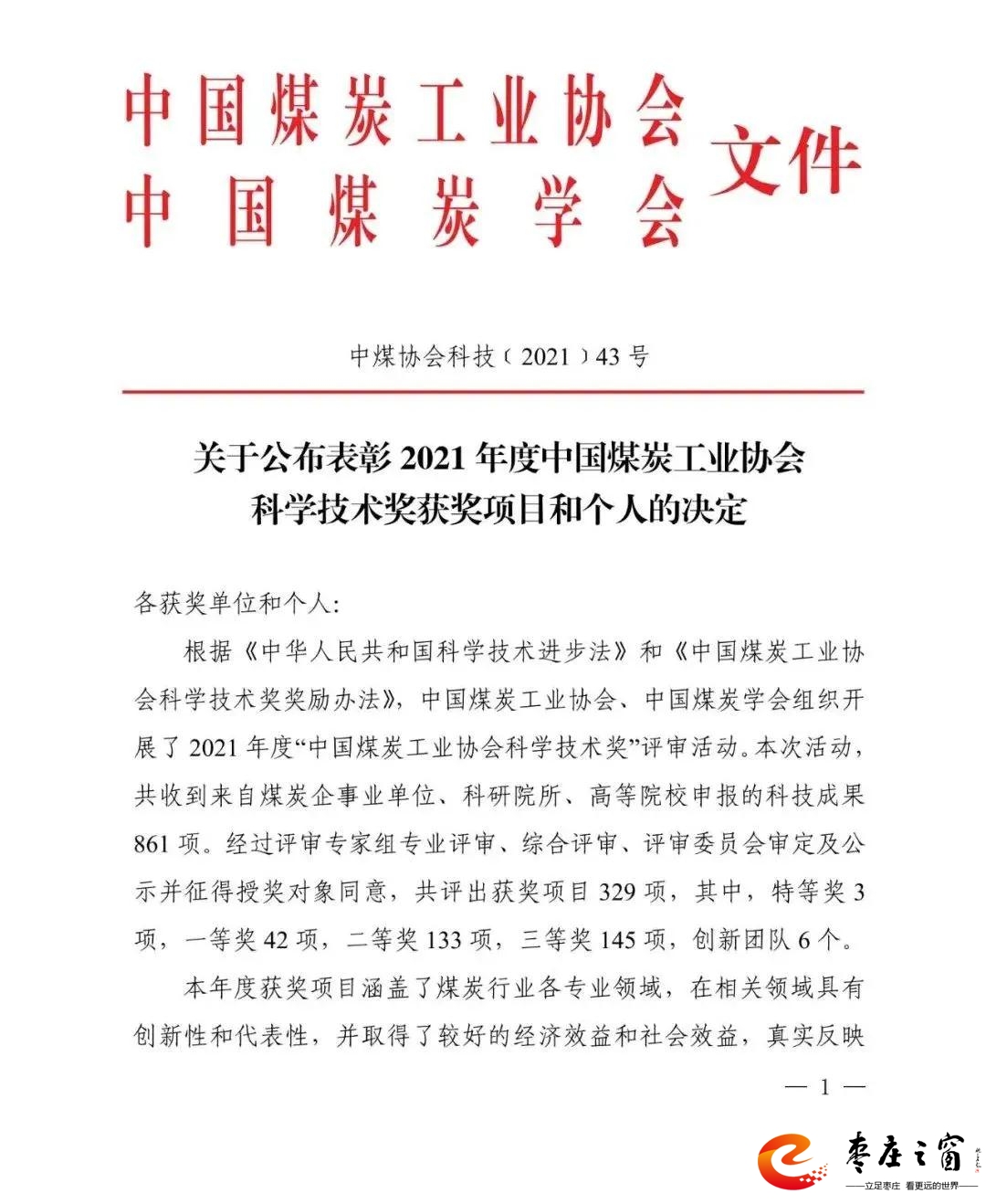 喜訊!田陳煤礦兩項科技成果榮獲2021年度中國煤炭工業(yè)協(xié)會科學技術獎